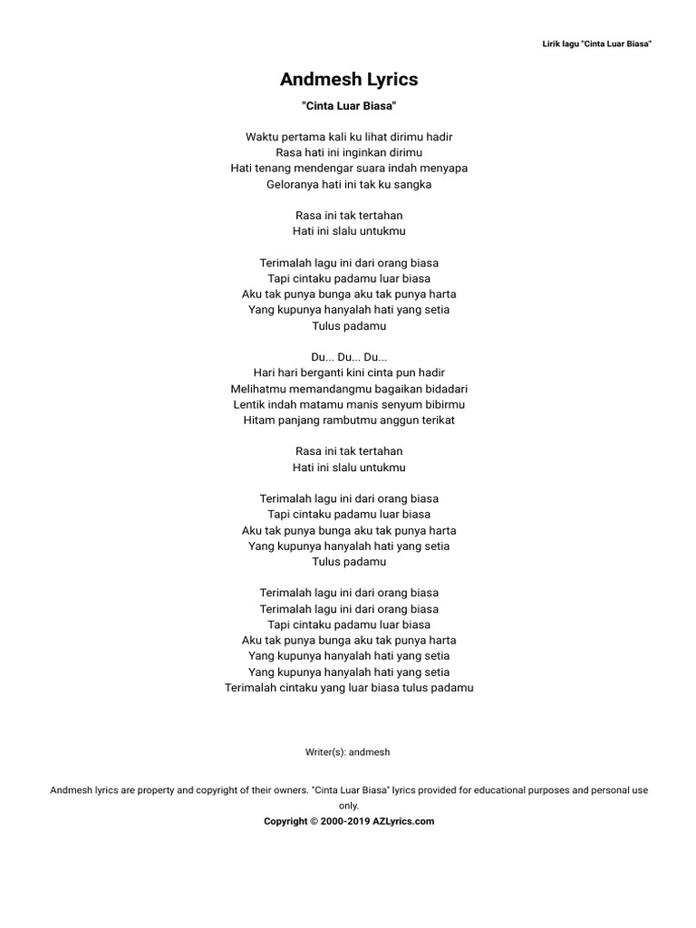 Andmesh Cinta Luar Biasa Lyrics Azlyrics Com