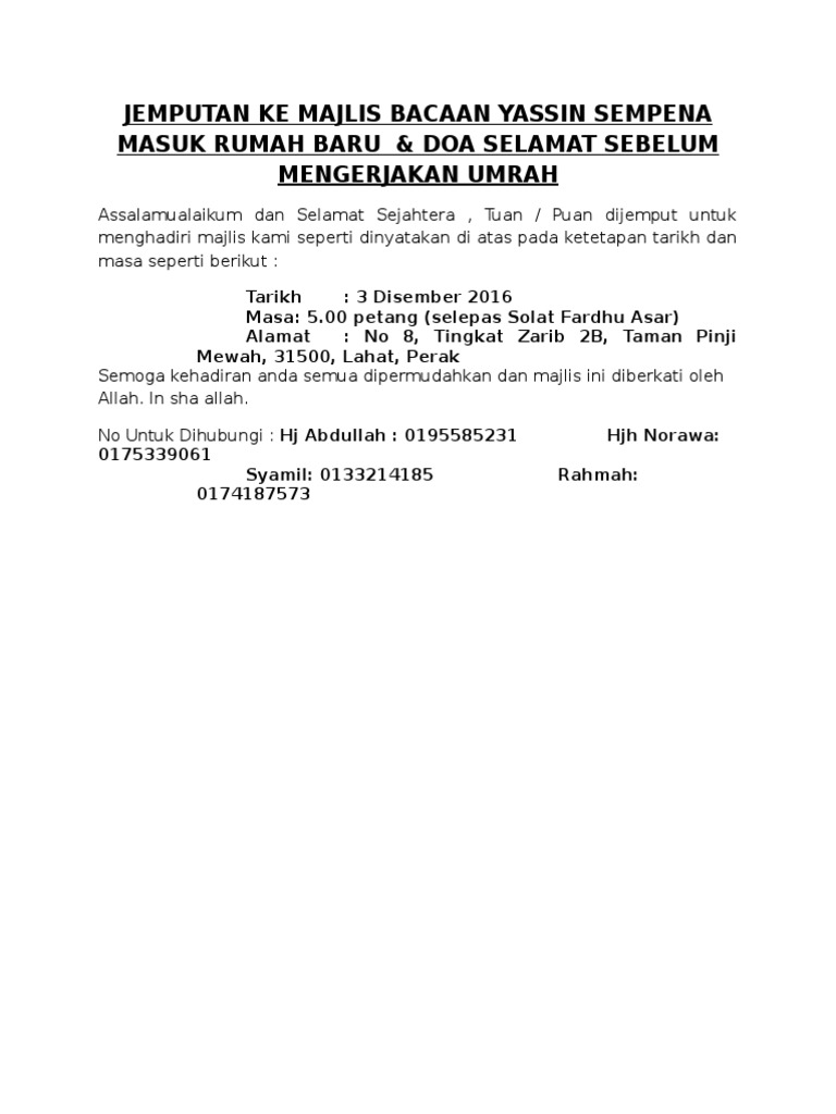 Jemputan Ke Majlis Bacaan Yassin Sempena Masuk Rumah Baru