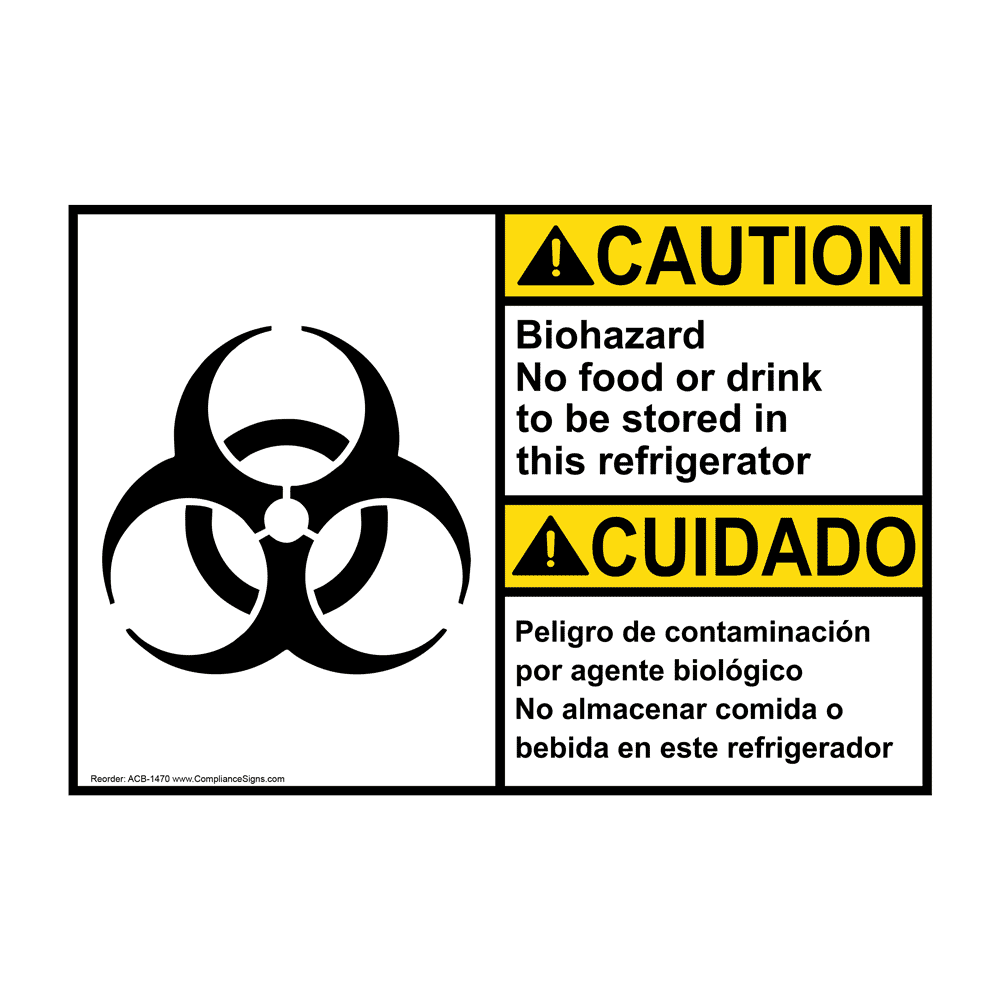 Use this bilingual osha notice sign to clearly state that food or drink is not allowed in the refrigerator. Osha compliant design displays the message in both english and spanish. Quantity price per sign 7 x 10. Next hang the no food or drink sign up where you need the sign to be noticed by your customers or employees.